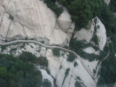 אחרי שהגענו בטיסה לשי'אן וגילינו שהמארחת שלנו מתעכבת ביומיים (עניינים באוניברסיטה שהיא הייתה צריכה להשלים) אז החלטנו לשייף את כישורי הספונטניות שלנו ולטפס על הר. הר חואה מרוחק כשעה (אולי שעתיים..) משי'אן, וזוכה למטפסים רבים עקב העובדה שהוא אחד מההרים הקדושים לדת הדאואיסטית בסין. אחרי נסיעה לא קצרה באוטובוס הגענו לכפר חואה-שאן שזה כפר שמלא בחנויות ממכר ציוד למטפסים וחלק מהם מציעים גם לינה.. הצלחנו למצוא דיר חזירים במחיר מציאה של 50 יואן (25 שקל). מאושרים מהעסקה המשתלמת הבנו שמקומנו לא בחדר הזה והחלטנו להקדים את הטיפוס ללילה.. (במקום לישון ולטפס.. פשוט נטפס ונתפוס תנומה על הפסגה..) העניין של הטיפוס בלילה נפוץ אצל הסינים שאוהבים לטפס בלילה הקריר ולראות את הזריחה מהפסגה. הטיפוס התחיל ב-12 בלילה והיה מפרך הרבה יותר ממה שחשבנו... יש חלקים שהם ממש כמעט אנכיים, וחייבים להאחז בשלשלאות מתכת בצידי הדרך תוך כדי העליה... מזל שהיה חושך, ככה ראינו רק גרם מדרגות אחד בכל פעם... אחרי 5 שעות של טיפוס מפרך החלטנו להוריד עוגן ולפתוח שקי שינה.. וככה תפסנו לנו תנומה על אחת מהפסגות של ההר העצום הזה... אז התחלנו לתרגל כישרון מושרש נוסף שלנו - כישרון הסנוז... כלומר, פיספסנו את הזריחה כי החלטנו להסנז מספר פעמים...
